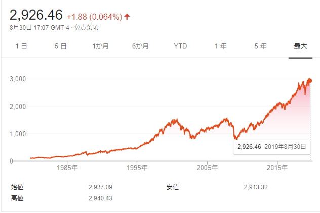 以下はYahoo!ファイナンスで取得した、2019年8月30までのS&P指数の推移です。
