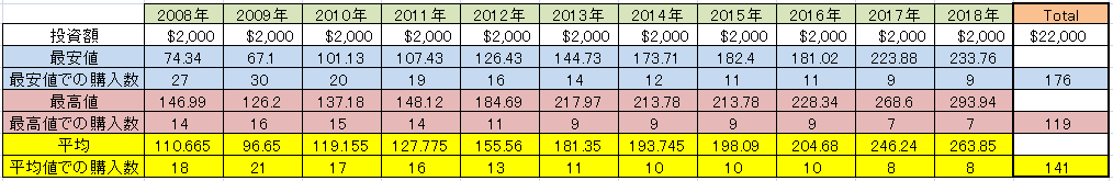 10年間で累計で$22,000投資していますので、最安値で購入しつづけた場合は資産が約2倍弱になっています。