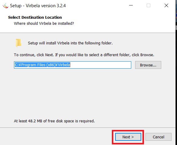 ダウンロードした、[VirbelaSetup.exe]を実行して、VirBELAのセットアップを開始します。