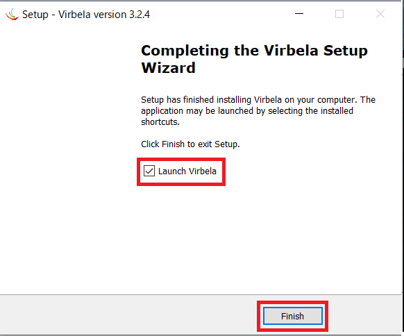 この画面が出ればインストールは完了です。[Launch Virbela]にチェックを入れたまま[Finish]をクリックするとVirBELAが起動します。