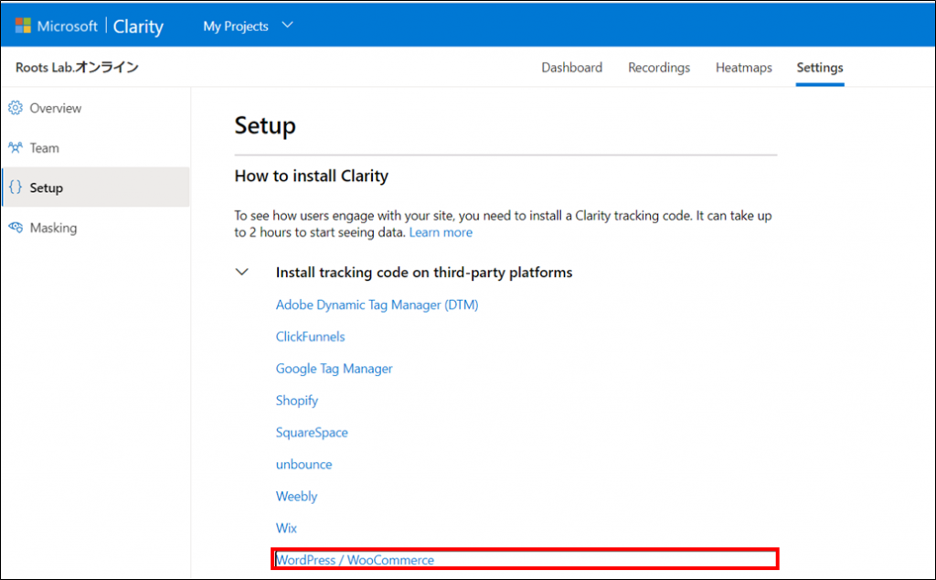 下図の[Setting]-[Setup]から[WordPress / WooCommerce]をクリックします。