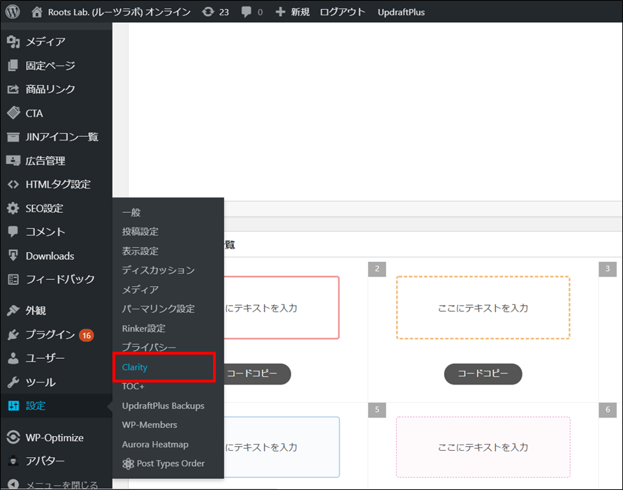 WordPressに戻り、[設定] – [Clarity]をクリックします。