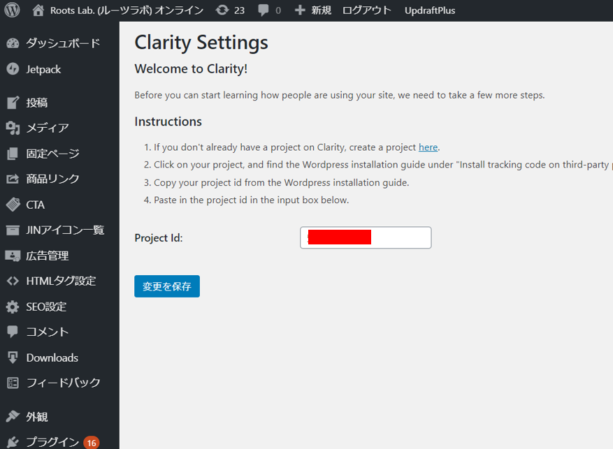 下図の赤枠部分に、先ほどコピーしたClarityのIDを貼り付けます。