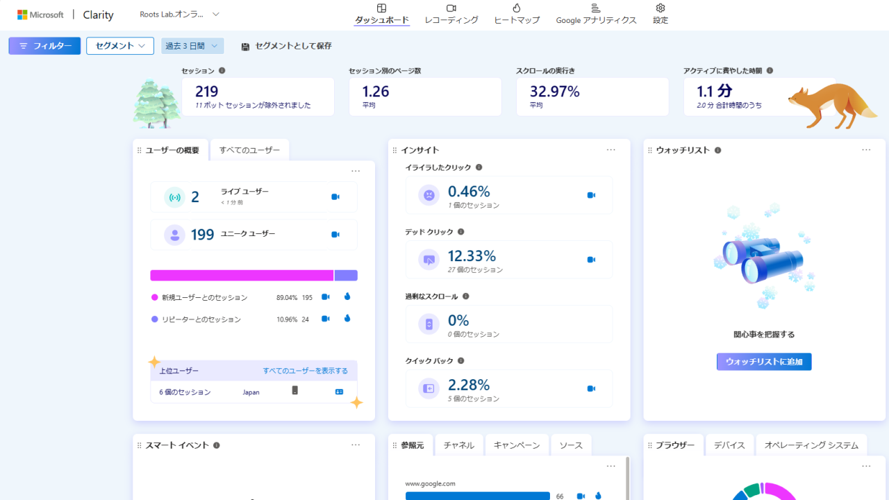 Microsoft Clarityを使えばそんな悩みを簡単に解決できます。クリックされた場所やスクロール率、ページ滞在率など、様々な観点でサイトを分析するする事が可能です。