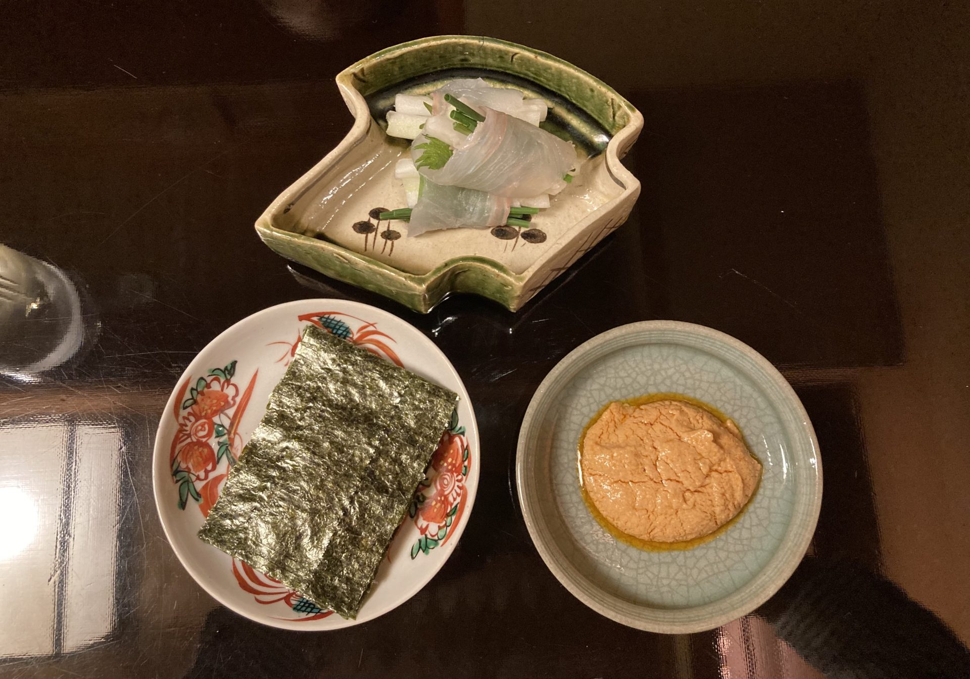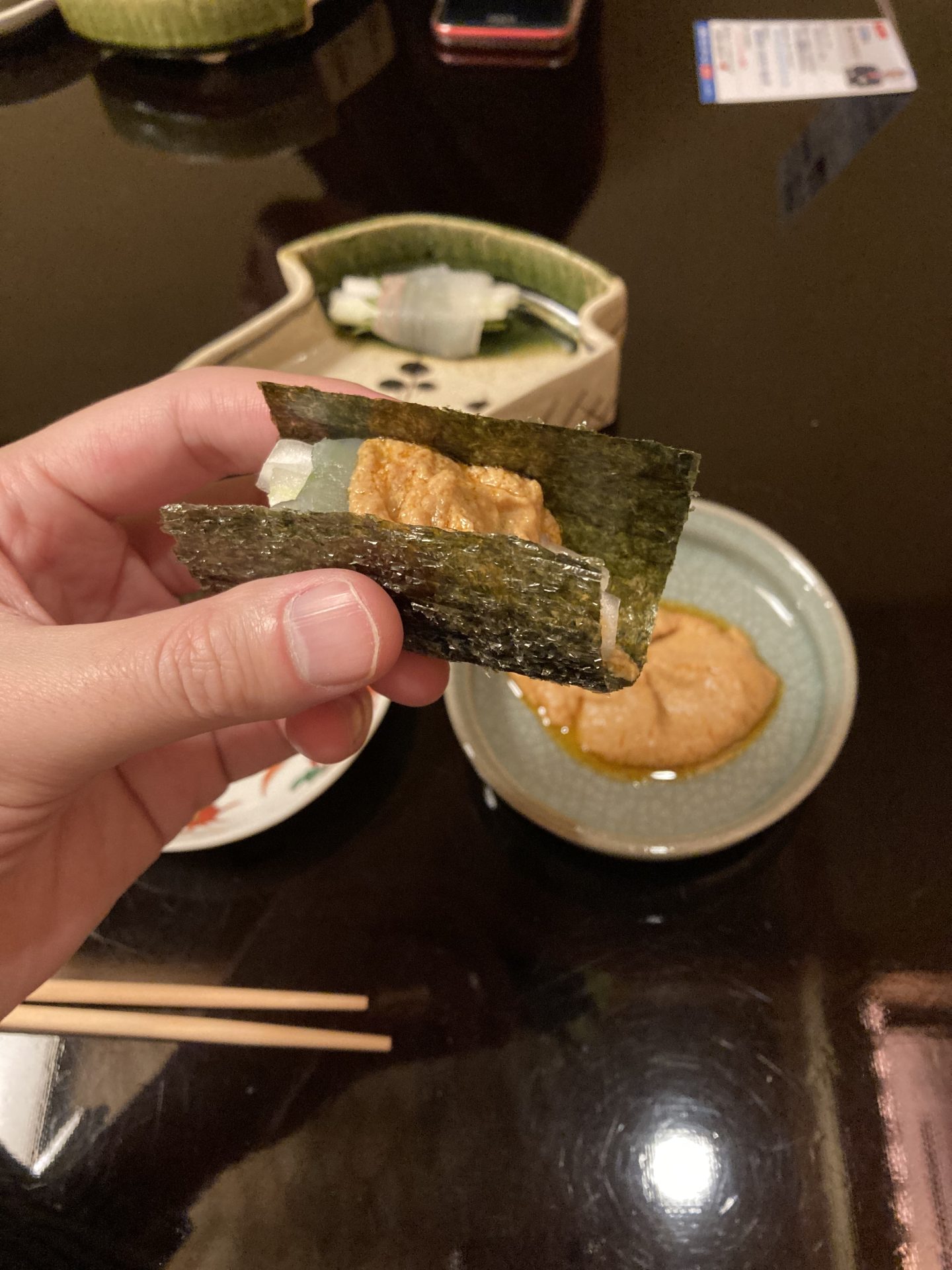 こうやって、巻いてあん肝ソースを乗っけて食します。海苔もソースも、もちろん刺身も美味い!食の繊細さと大胆な組み合わせが共存する、記憶に残る一皿だ。
