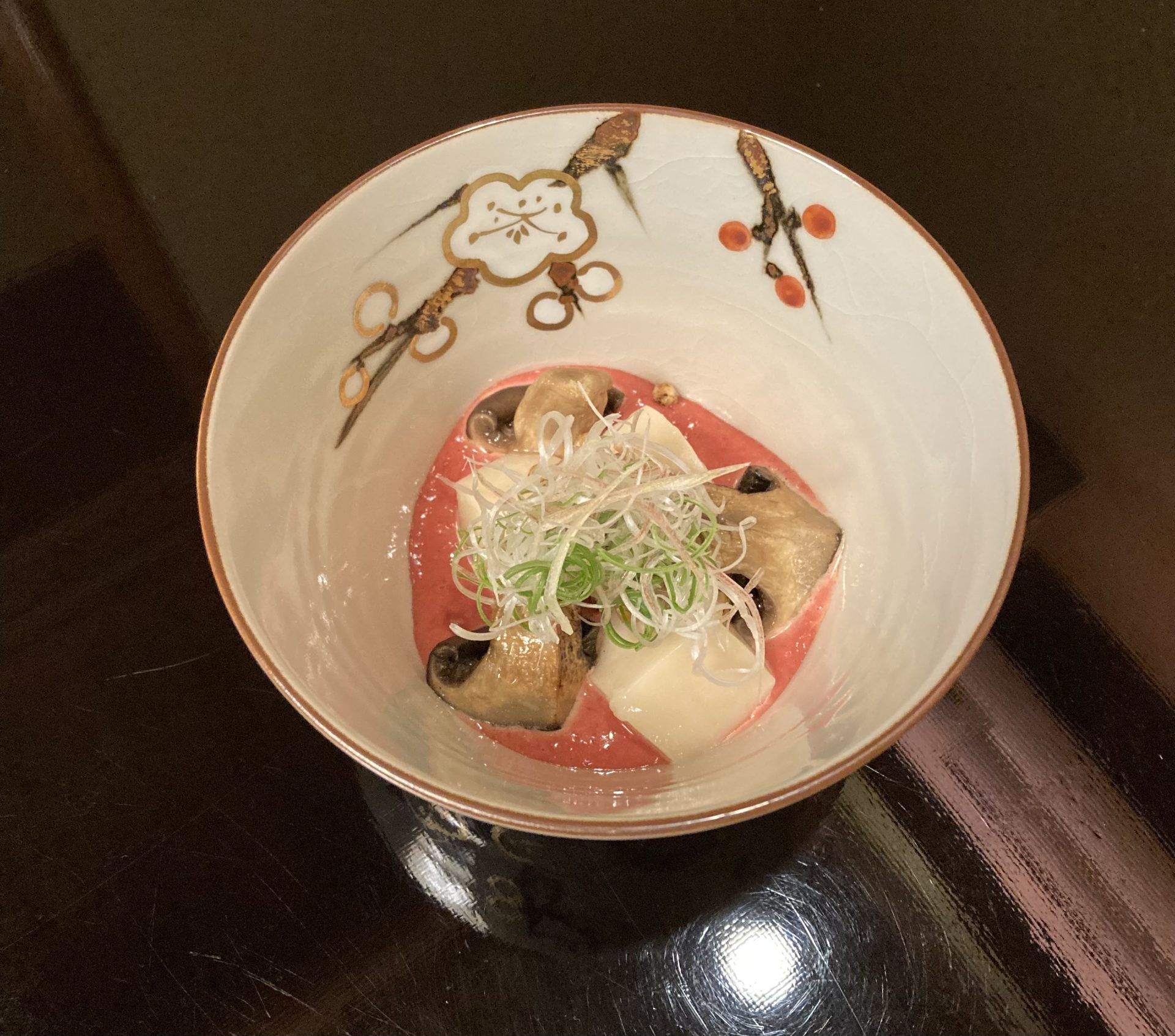 この料理は、胡麻豆腐の滑らかな土台に、香ばしく焼き上げたしめじを重ね、鮮やかな九条ネギを散らした一品。