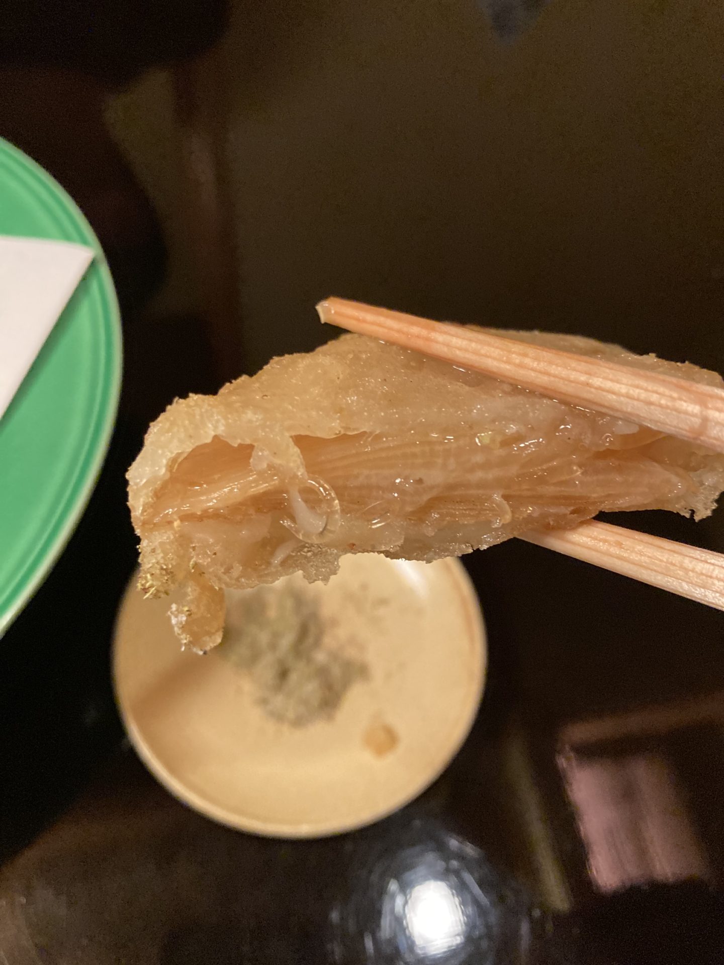 器はシンプルな皿で、料理の存在感を際立たせる。フカヒレを揚げるという大胆な発想は、和食の枠を超えた「麻布 かどわき」の創造性を象徴しており、伝統と革新が見事に融合した一皿。庶民的な唐揚げのスタイルに高級食材を落とし込んだ遊び心も感じられる。