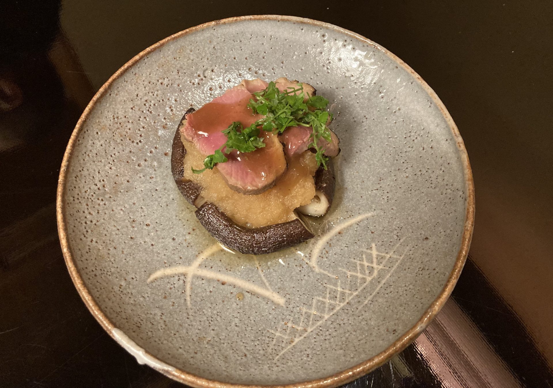 来ましたよ、これ。キノコの上に鴨が乗って、その上に木の芽が振りかけられさらにその上にみぞれあんかけがぶっかけられたこれ、そうキノコ。