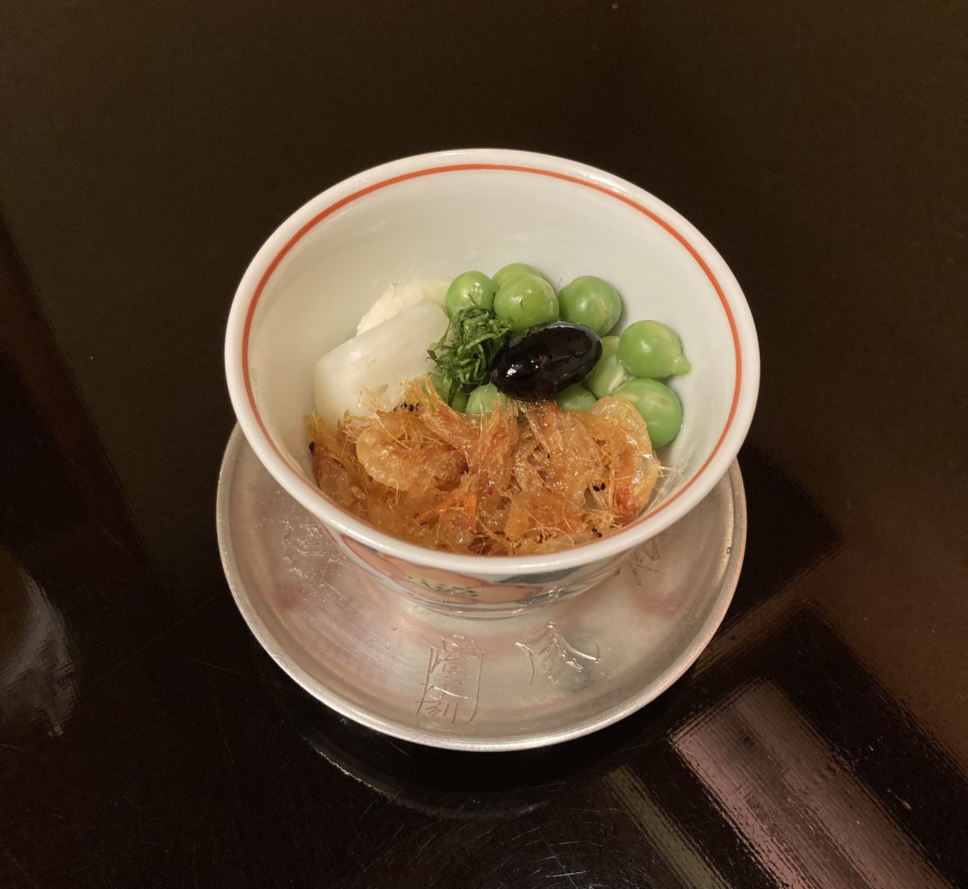このお通しは、鮮やかなグリーンピースを主役に、干しエビを合わせた一品で、ほのかに米が加えられた驚きの構成。